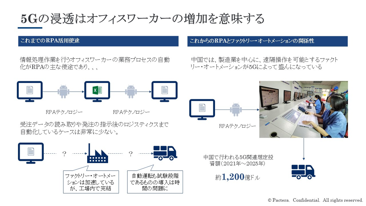中国では、5Gによってエッセンシャルワーカーをオフィスワーカー化する動きが活発であり、RPAテクノロジーを活用して工場や倉庫のオートメーション化も同時に実現できる可能性があります。従来のRPAはオフィスワーカーの手作業による業務の効率化を目的としてましたが、エッセンシャルワーカーの業務へも活用されると考えられます。従業員同士の接触による感染リスクを抑えながら、生産性を維持できるソリューションも提供されています。