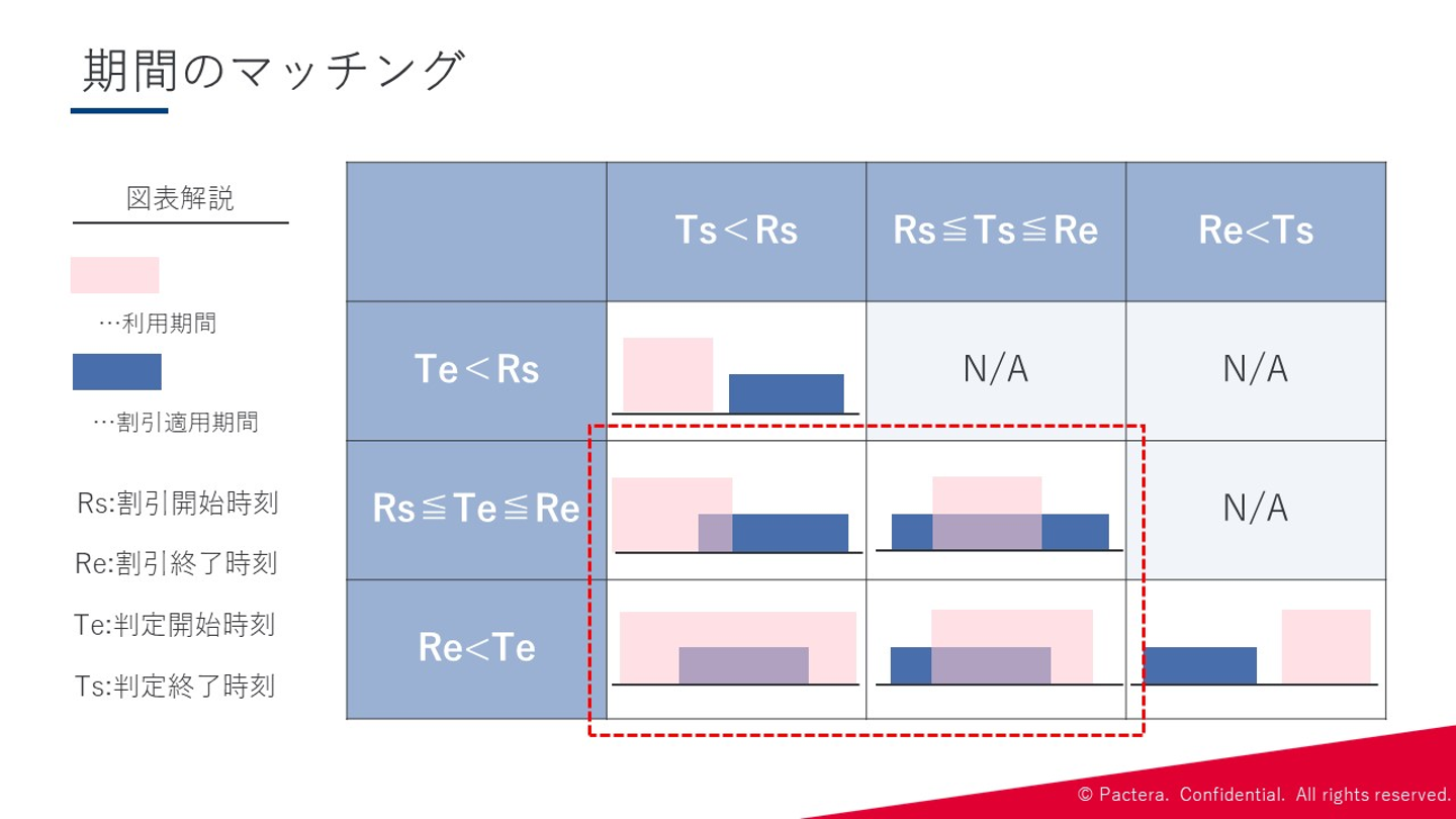 上記のようにパターンを図表化すると、コードへ落とし込む適用時間帯の定義は赤点線で囲った範囲になります。