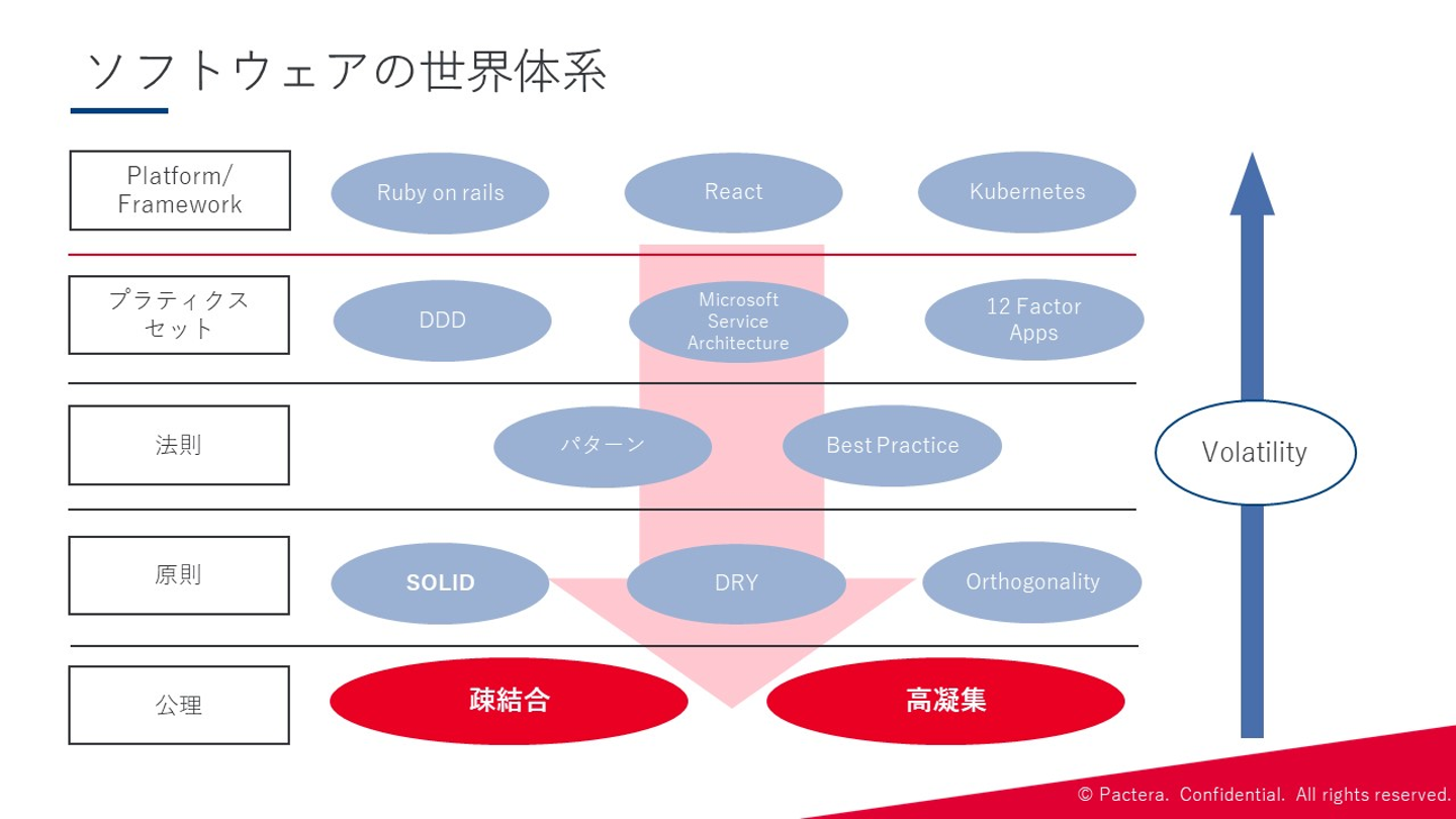ソフトウェアの世界における公理は不変の概念とされており、疎結合と高凝集の2つの要素が存在します。