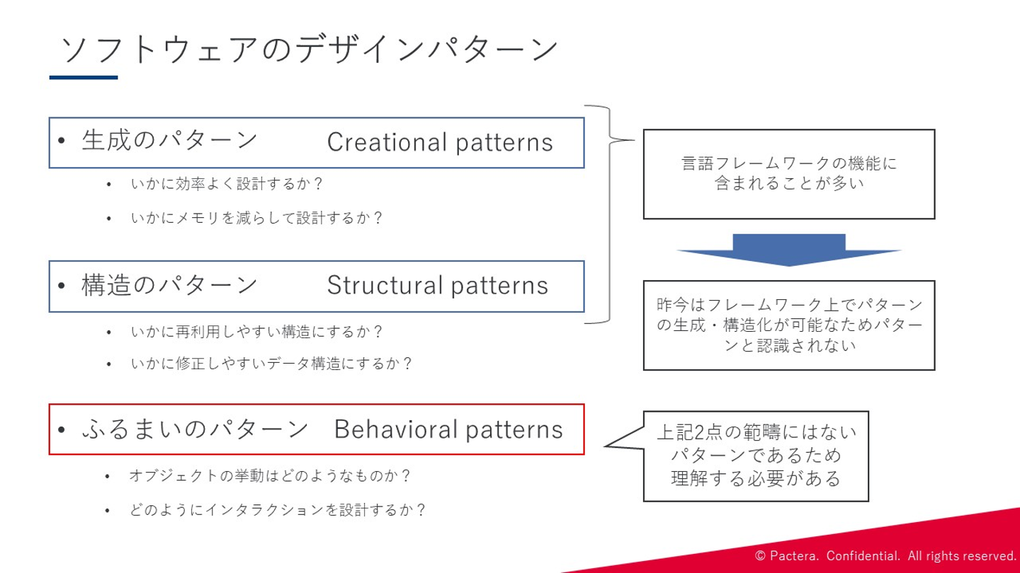 ですが、そのいくつかは保守性の高いコードを書くためには必要不可欠で、なかでもふるまいのパターンはアプリケーション開発者にとっても重要なものが多いのです。