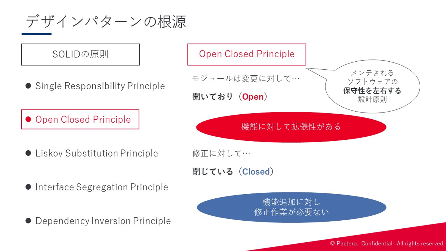 特に着目すべき点は、Open Cloosed の原則で、モジュールは変更に対して開いており、修正に対して閉じているべきとされており、長期メンテナンスされるソフトウェアの保守性を大きく左右する設計原則となります。