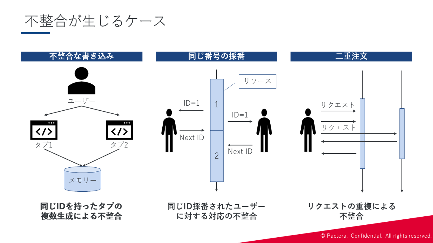 クライアント(ユーザー)毎に同じIDを割り振り、同時に何らかのリクエストされると、リクエストの内容は違うにも関わらず、同じ処理をしてしまい不整合が生じてしまいます。