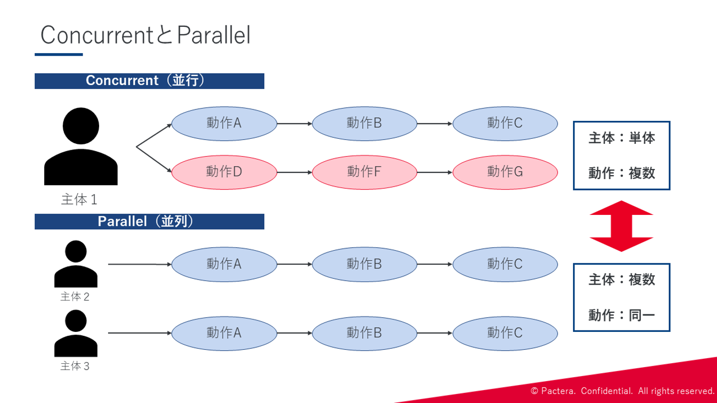 同じ「同時」でも主体の個数によって、定義が変わることが分かります。排他制御において、対象となるのはConcurrent(並行)での同時となります。