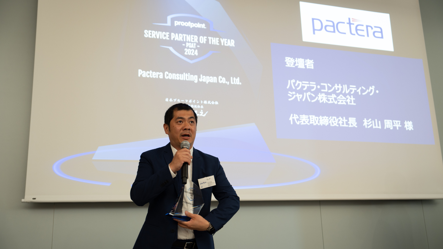 2024年5月17日にサイバーセキュリティとコンプライアンスのリーディングカンパニーであるプルーフポイント社が開催した日本向けイベント「Proofpoint Partners' Day 2024」にて、パクテラ・コンサルティング・ジャパン株式会社(以下、パクテラ)は、2024年度サービスパートナー・オブ・ザ・イヤー(PSAT部門)(Service Partner of the Year - PSAT – 2024)を受賞しました。