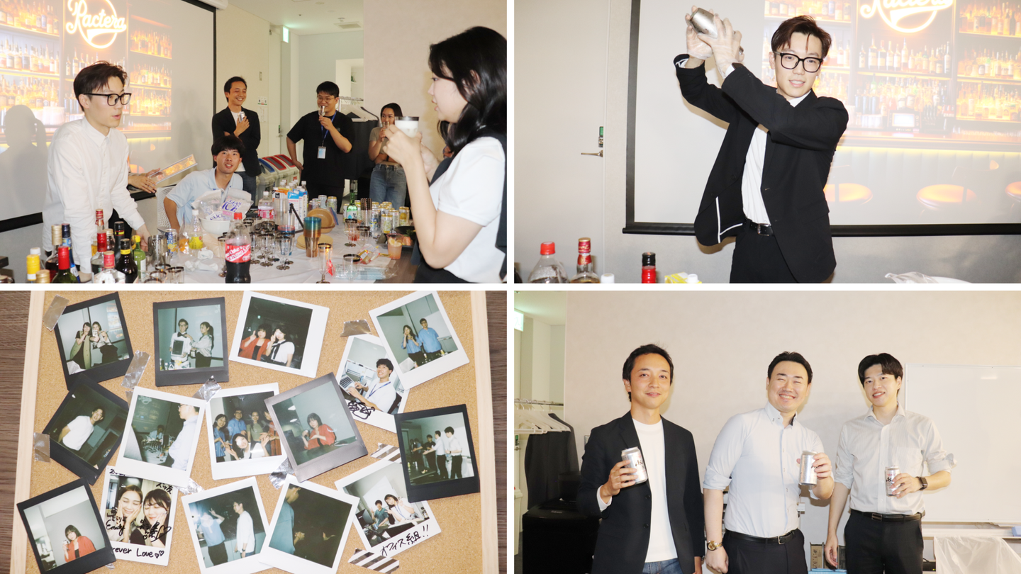 ▲写真上:今年新卒入社の董(トウ)がバーテンダーとして、カクテルを社員に振る舞ってくれました、左下:社員それぞれがインスタントカメラで撮影した写真