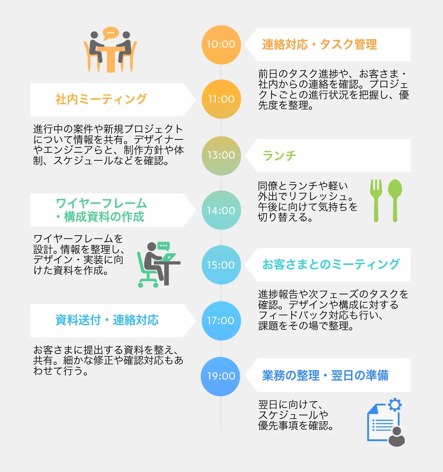 私の1日は、まず出社後にメールやチャットの返信、その日のスケジュール確認から始まります。午前中は、社内・社外を問わずプロジェクトに関するミーティングが立て続けに入ることが多いです。適度に休憩を挟みながら、夕方頃まで打ち合わせや案件の整理を行います。夕方以降は、日中の打ち合わせ内容をまとめたり、自分の担当タスクに集中する時間としています。