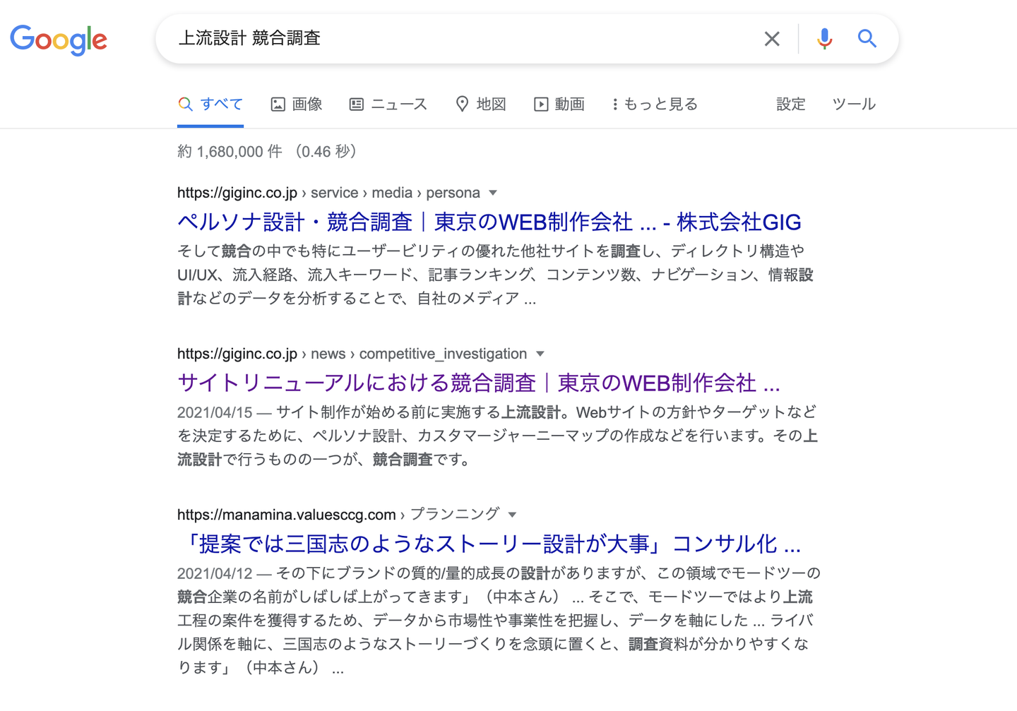 「競合調査とは、同じ業界や同じ顧客層をターゲットするサイトを、さまざまな観点から比較し、調査することを指します。ちなみに『上流設計 競合調査』で検索をかけるとGIGの記事が上位表示されるんですよ」