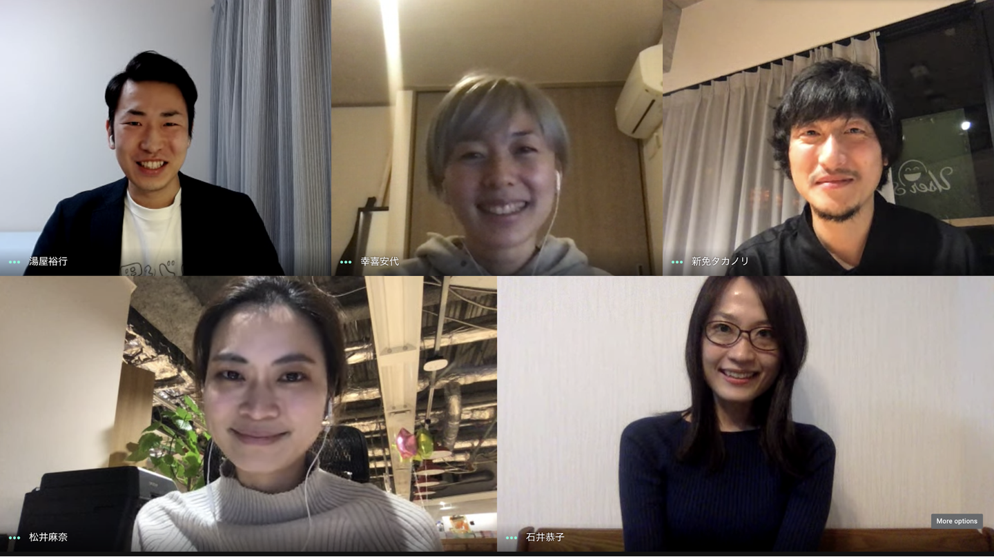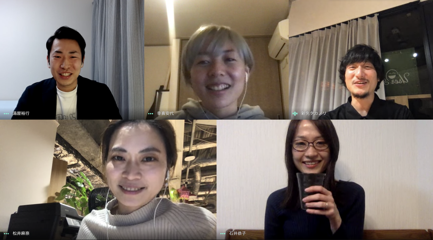 ▲ リモートでのインタビューを実施 | 左上:GIG湯屋、真ん中上:幸喜さま、右上:新免さま、左下:松井さま、右下:GIG石井