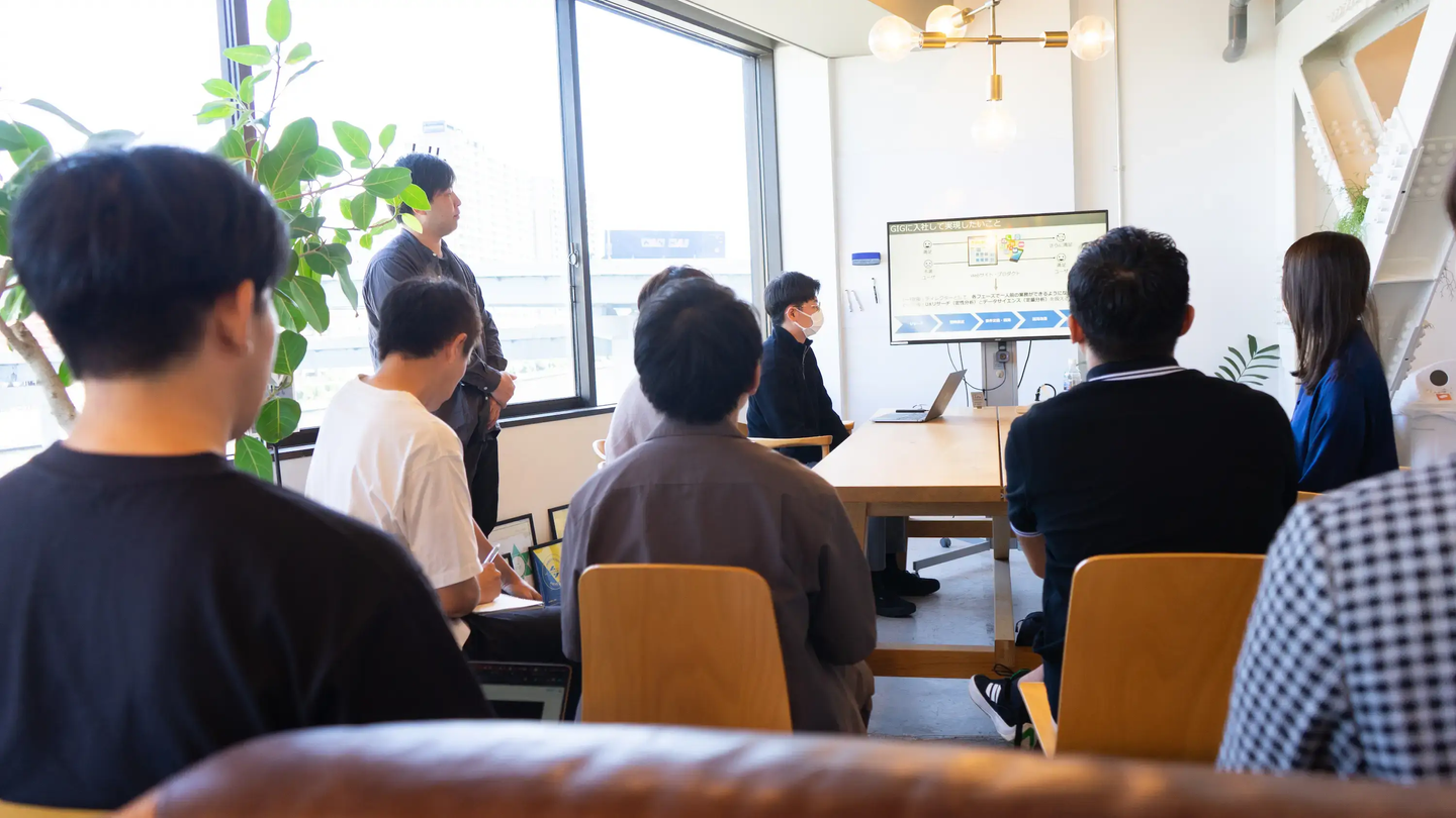 出社とリモートワークを組み合わせたハイブリッドワークを採用しているGIGですが、今日は代表・岩上をはじめ、経営陣と事業部長がオフィスに集まり、内定者の方を歓迎しました。