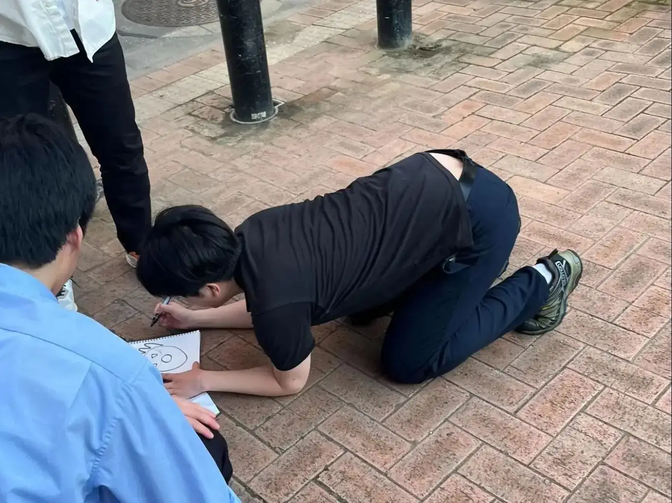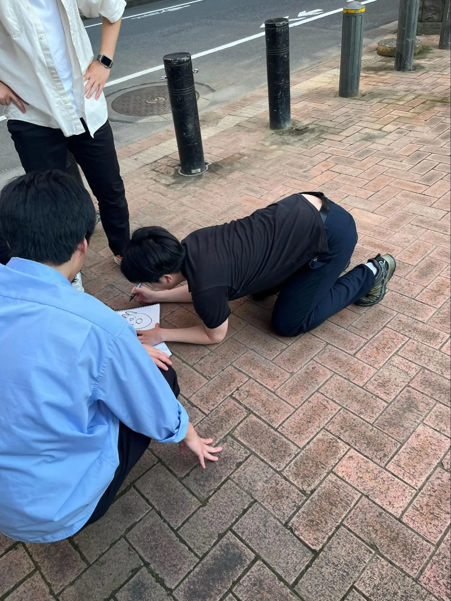 GIG取締役の賀川さんが、路上で四つん這いになりながら何かを必死で描き上げようとしています。見るからに緊急事態です。