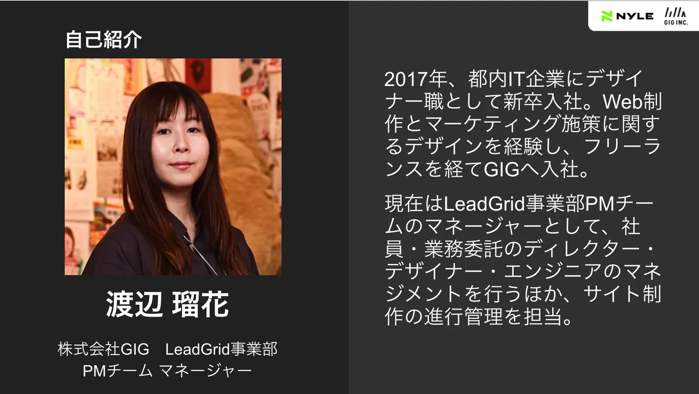 株式会社GIGの渡辺瑠花です。ここからは私が、実際にサイト制作を進めていく流れや、それにまつわるCMSの選び方についてお話しします。