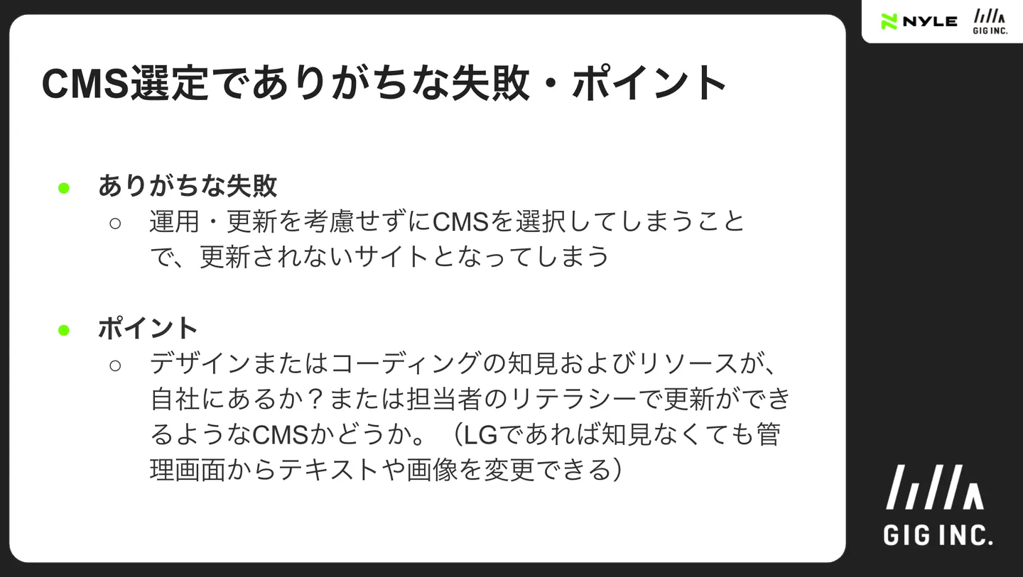 デザインまたはコーディングの知見が自社内にあるか、あるいは自社の担当者によって更新可能なCMSかどうか、を考慮して選ぶ必要があります。