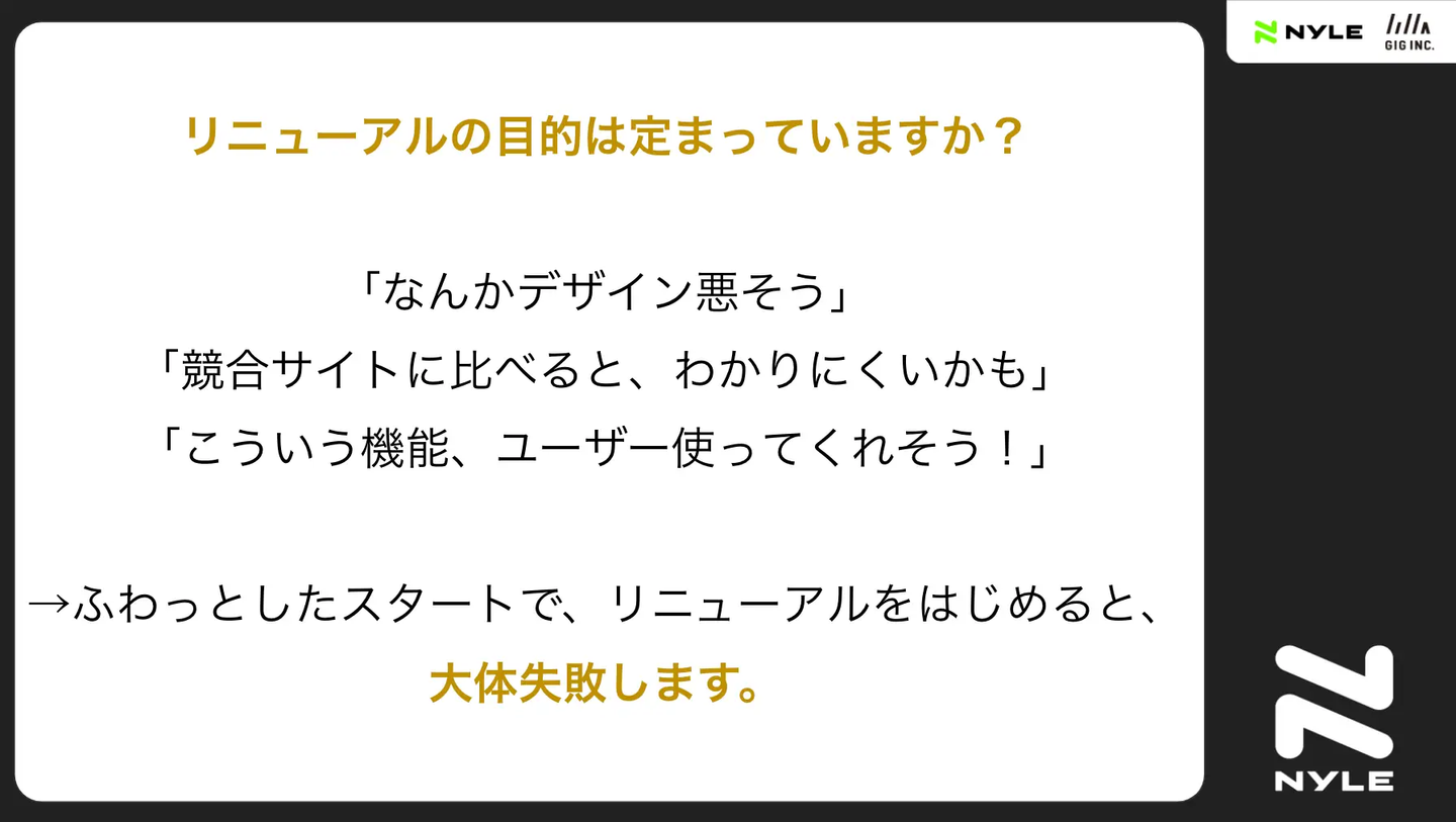 私がさまざまなご相談を受けるなかでも、「なんとなくデザインが悪いんだよね」「こういう機能があったらユーザーに喜ばれそうなんだけど……」と、そもそもの目的が定まっていない状態でリニューアルしようとしているケースが多いです。