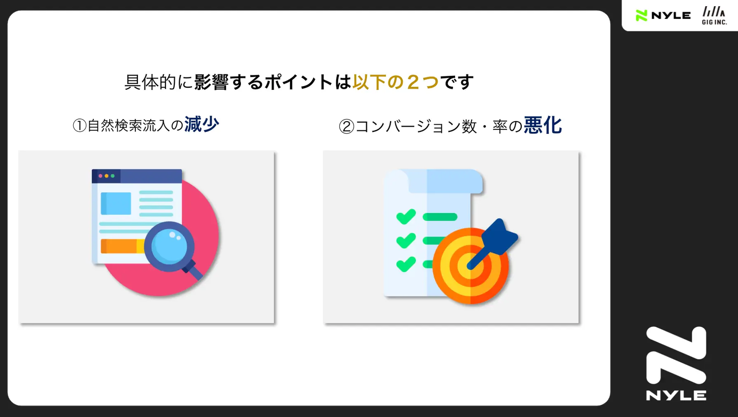 サイトリニューアルによって影響を受ける主なポイントについて「自然検索流入数の減少」と「コンバージョン数の悪化」の2点について解説します。