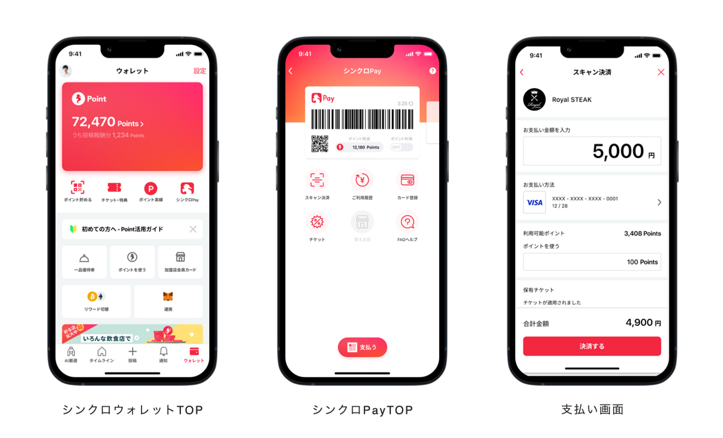2018年にスタートし「Eat to Earn」としては世界初(※3)となり、現在食いしん坊コミュニティによるレビュー投稿は累積40万件となります。AIが口コミを分析して個人の趣味嗜好に合ったお店をレコメンドすることで、ユーザーは最速でコスパの良いお店が見つかる新しい飲食店開拓サービスです。またシンクロウォレットではシンクロライフ加盟店でのポイントや、デジタル優待・会員証などが一元管理でき、継続来店の楽しさも同時に提供しています。