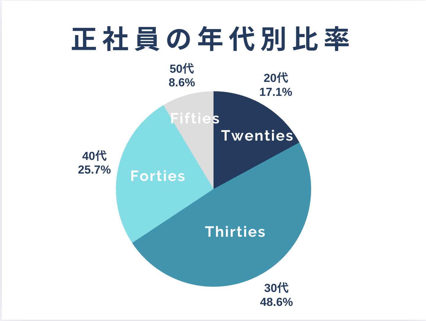 昨年までは学生のアルバイトの皆さんも集計に含めていたのですが、今回は社員のみを対象としたため、20代が減ったように見えるかもしれません。ただ、実際に若手社員が減ったわけではありませんのでご安心を。学生のフレッシュな若さ、恐るべしですね…!笑