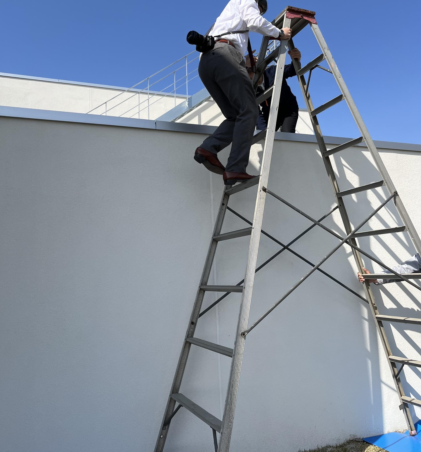 Nesradの屋上には、現在ヒラソル・エナジーが建設中の太陽光発電所があり、近々完成予定です。防犯のため外部から屋上に行く階段はなく、約2mほどの高さを脚立で登ったので、グラグラして怖かったです!ここで発電した電力を用いて、ヒラソルOpenEMS制御の実証実験や施設内の電力供給、PPLC™監視プラットフォームの実証実験などが行われます。また、屋上から北を望むと、ヒラソルが2019年からPPLC技術の実証試験を行っている米倉山太陽光発電所が見えます。