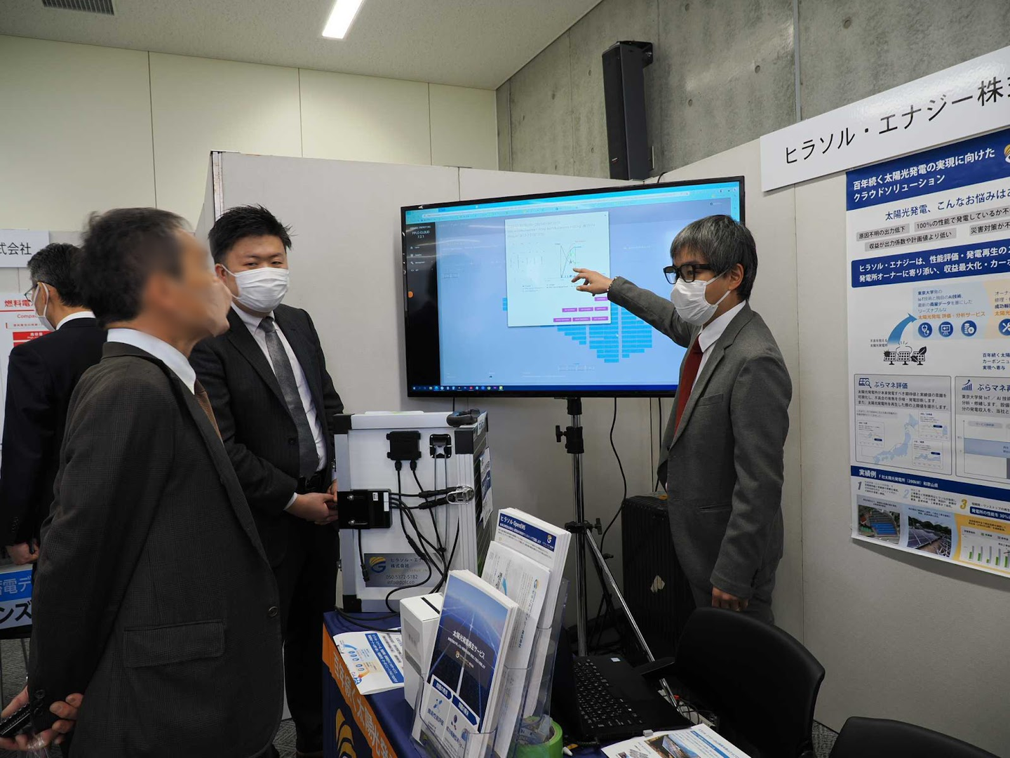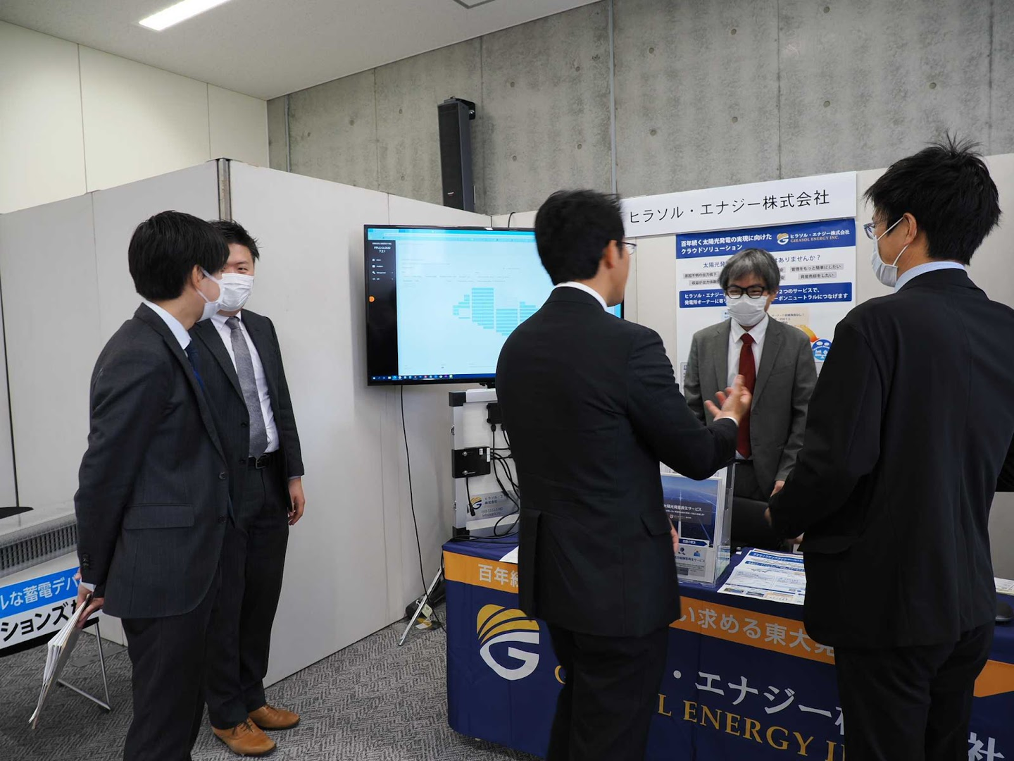 各入居企業プロジェクト紹介では、代表の李旻とCTOの池上、営業責任者の庄田がブースにて、ヒラソル・エナジーの取り組みや、実際のPPLCセンサーのデモなどをお見せしながらご説明しました。来場者からは、ヒラソルの技術に対する興味や期待の声が多数聞かれました。