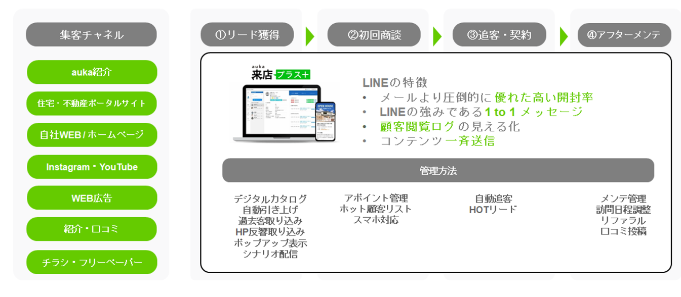 エンドユーザーに普及している、LINEというツールを使っている点が大きな強みです。来場前から成約、アフターフォローまでお客様とつながり続けることができます。