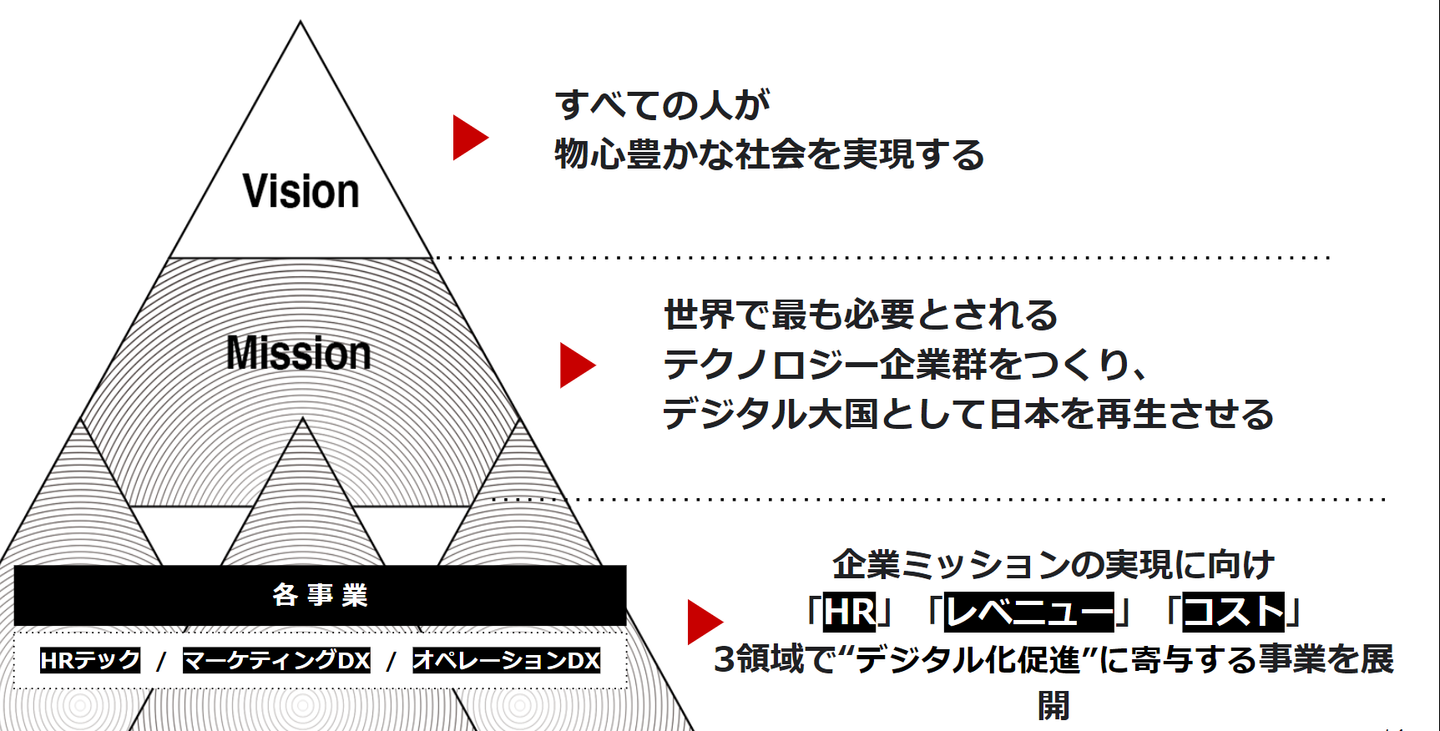 ギブリーは「すべての人が物心(ぶっしん)豊かな社会を実現する」というビジョンと、「世界で最も必要とされるテクノロジー企業群を作り、デジタル大国として日本を再生させる」というミッションを掲げています。