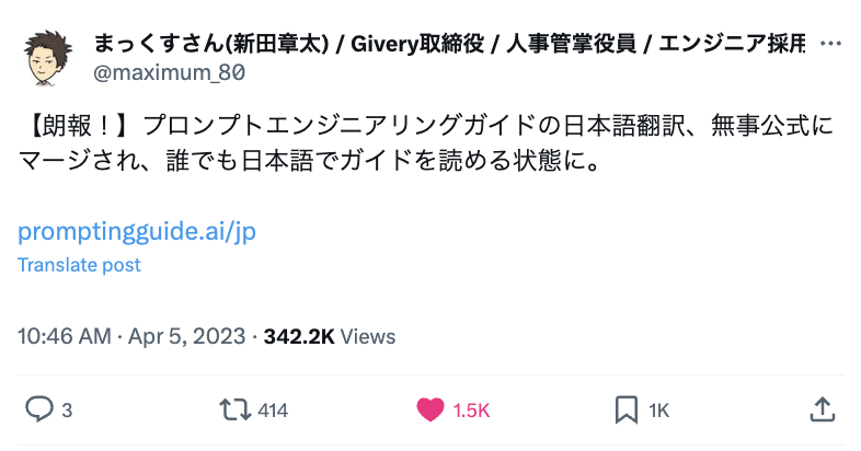 例えば、新田さんもChatGPT使いながら公式のプロンプトエンジニアリングガイドを翻訳して、リリースしてましたよね。当時、「わからない人はとりあえずこれを読めばいいんだ!」って界隈がかなり話題になりましたよね。