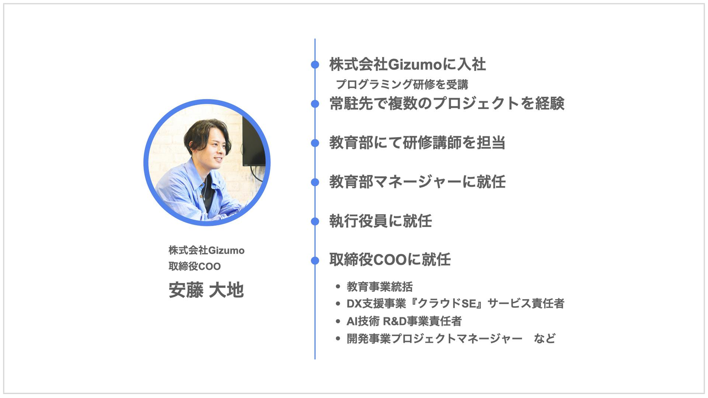 教育、開発、DX支援など、幅広い事業に携わっている安藤さんですが、実はGizumoで研修を受けてエンジニアになったメンバーの1人です。エンジニア教育のこだわりや、開発の強み、会社のこれからについてなど、じっくりとお話をお聞きしました。