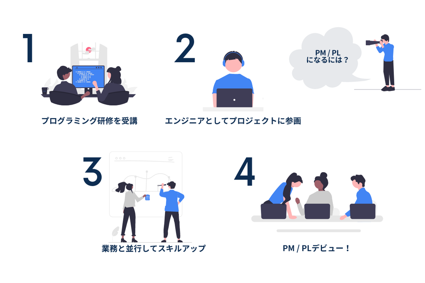 Gizumoでは、開発経験を積んだ上でPMやPLをお任せしています。具体的なキャリアステップをご紹介します!