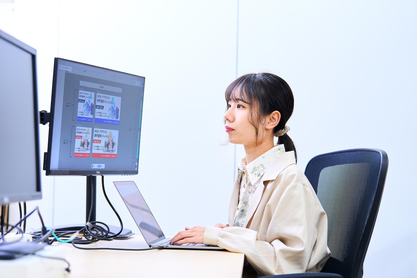 Webデザイナーとして経験豊富なメンバーがいるので、その方が作ったスマートフォン向けのデザインを私がPC用に起こしてコーディングまで行うことが多いです。自分が作ったものに「ここはこうした方が良いよ」とアドバイスをもらえるので、デザインスキルが向上している実感を得られてすごく楽しいです。