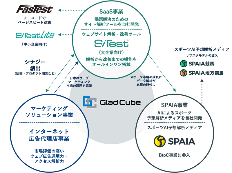 私たちは、SaaS事業をはじめ、Yahoo! JAPANやGoogleに代表されるようなインターネット広告代理店事業(マーケティングソリューション事業)とスポーツデータ解析メディアを運営するSPAIA事業の主要3事業を展開する企業です。