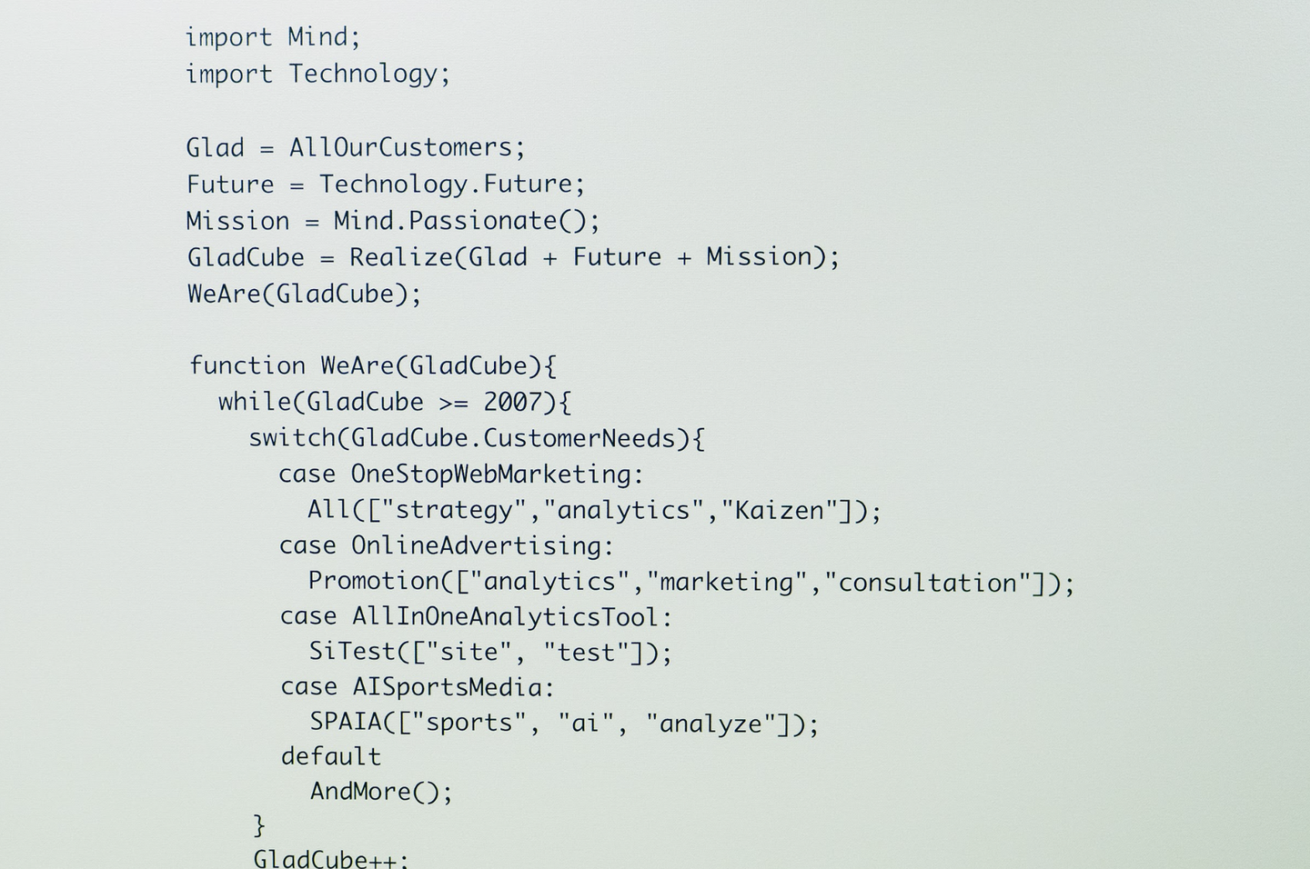 ※エントランス。当社のエンジニアが、壁の装飾としてグラッドキューブについてコード風にアレンジしたものです。インターンに参加してくれたエンジニアの学生さんからは「かっこいい!」と好評でした!