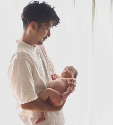 ▼ 生まれたばかりの息子さんを抱く櫻田さん