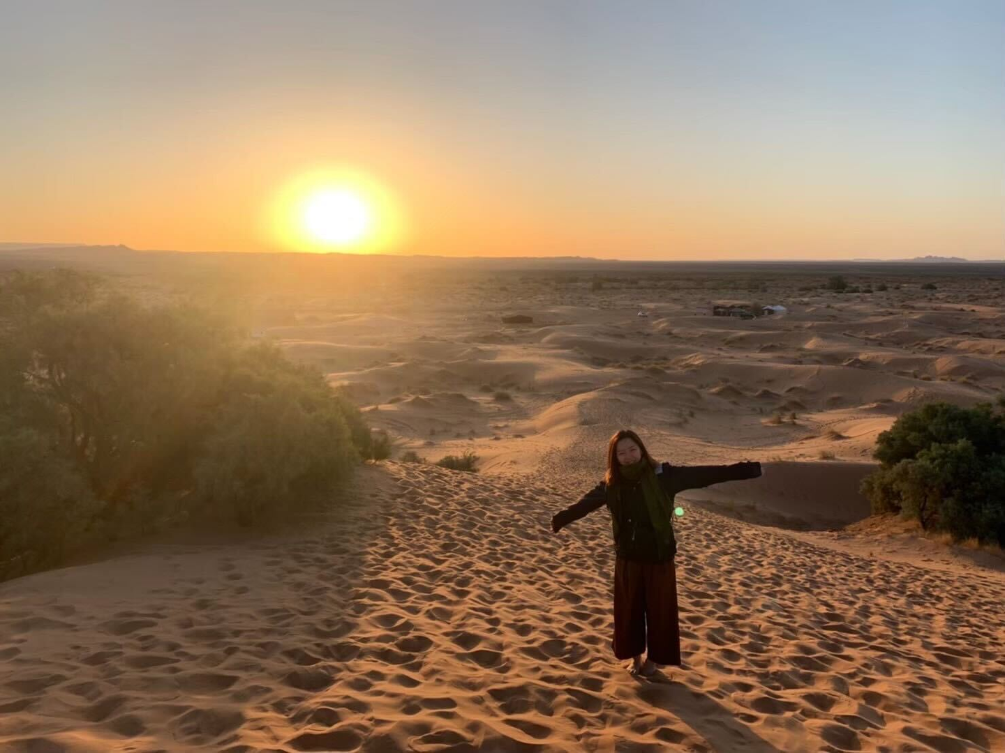 ■ 旅行先のサハラ砂漠(モロッコ)で大きな夕陽と写る橡川さん
