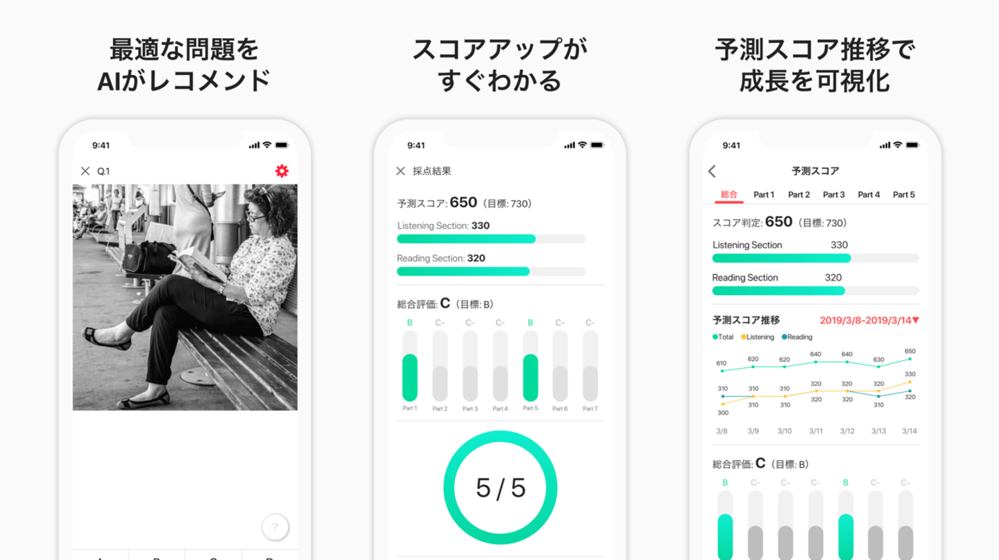 こうして2018年12月、20,000問以上の問題の中から最適な問題をレコメンドし、解答データに基づきスコアを予測する『abceed AI』をリリースしました。