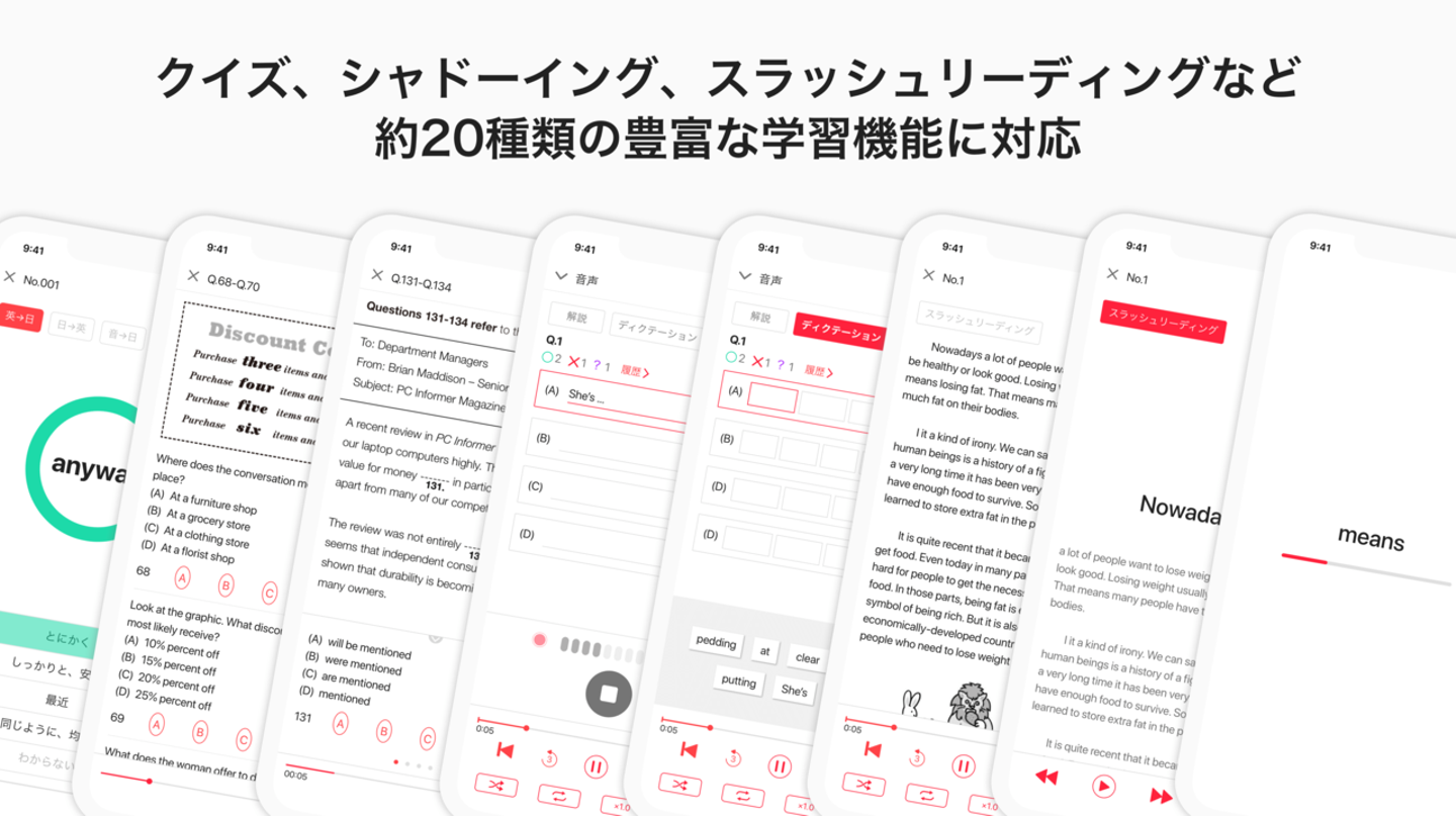 一方、機能を段階的に追加したこともあり、フェーズごとに追加した画面のデザインに統一感が無くなっていました。また、TOEIC教材だけでなく他の英語教材にも対応していく事を考えた時に整合性が取れなくなる箇所などもあったため、サービスの設計・デザインを1から見直すことにしました。妥協できず、思いの外時間がかかりましたが、2019年12月、磨き上げた新デザインをようやくiOSでリリースすることができました。(Androidは2月中にリリース予定)