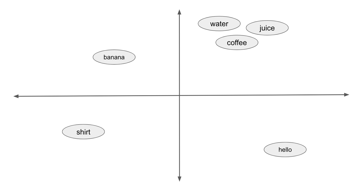 この〇〇に入るのは何でしょうか?waterやjuice, coffeeなどの単語が思い浮かびます。逆にbananaやshirtなどの単語は入りませんよね。とするとWord2Vecではwaterに対してjuice, coffeeは意味が近い単語、waterに対してbananaやshirtは意味が遠い単語という性質を反映するような表現を出力しようとします。