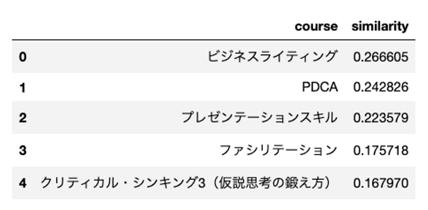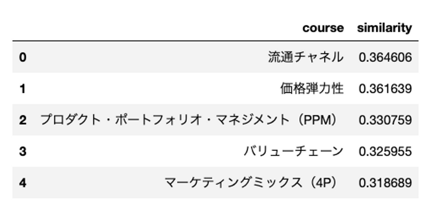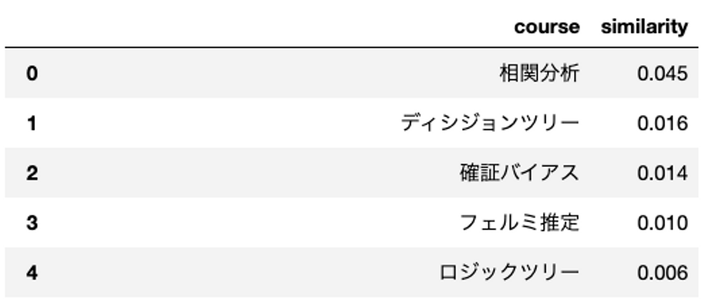 Word2Vecによって得られた分散表現からコース同士のコサイン類似度を算出してみます。