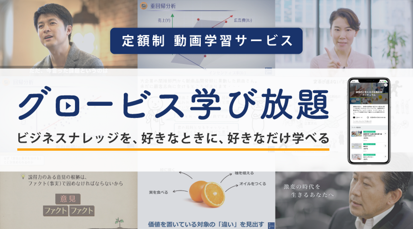 グロービス学び放題はグロービスの誇る良質なビジネスナレッジを動画で時間や場所の制約無く学べるサービスです。