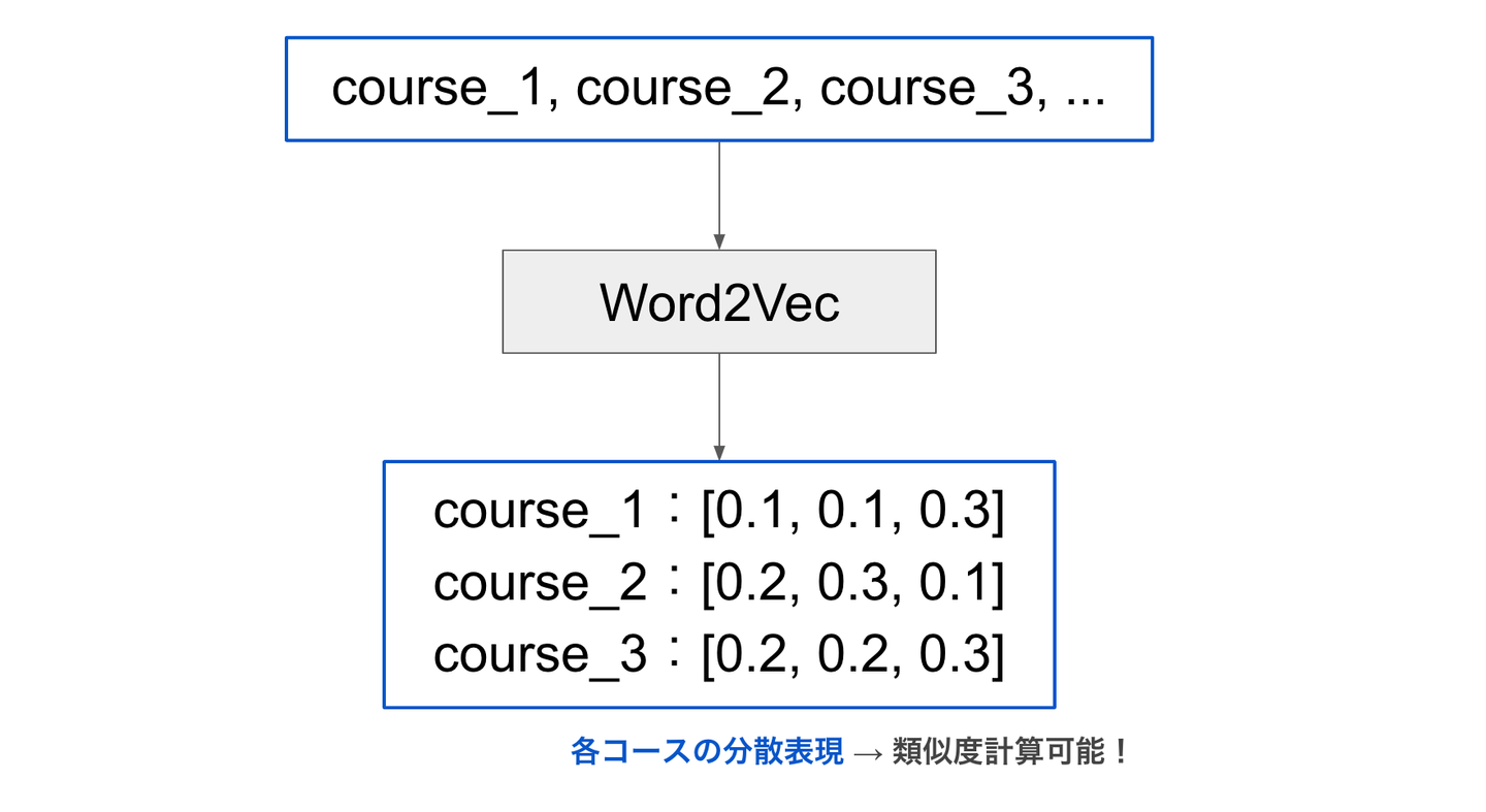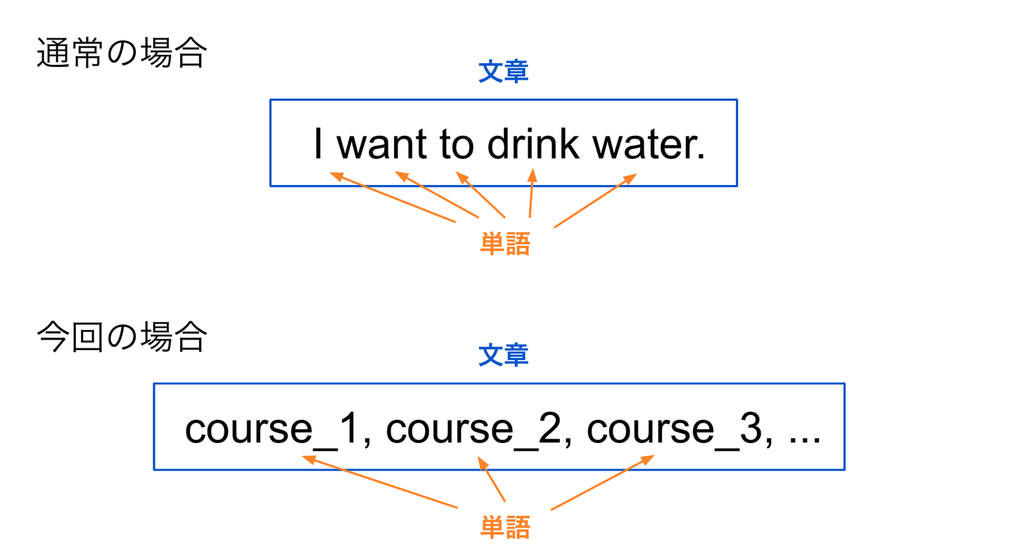 ① 各ユーザーがアクション(閲覧など)したアイテムを時系列に並べ、文章とみなす。