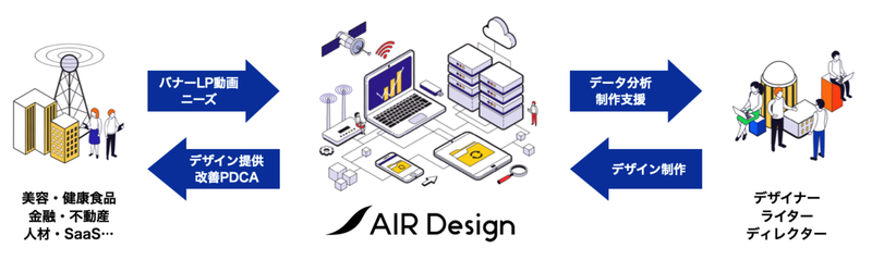 AIR Designは、主に広告用のクリエイティブ(バナー・LP・動画)を必要とするクライアントに対して、AIやデータに基づいた制作プロセスで、高品質なクリエイティブを短納期で提供し、さらには運用結果を元に改善を繰り返す一連のデザイン提供サービスです。