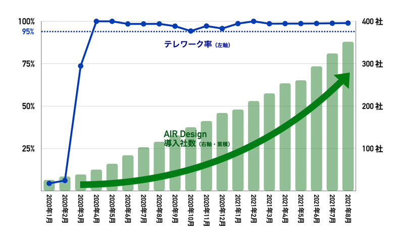 2020年4月以降のテレワーク率は平均98.3%という驚異的な数字で、かつこの間にAIR Designの導入社数は大幅に伸長。