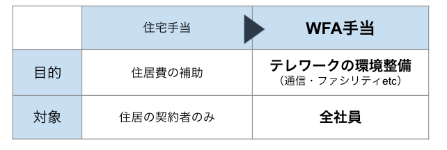 「"Work From Anywhere"=どこでも働ける」をサポートするため、住宅手当をリニューアルして「WFA手当」を設定し、対象も全社員に拡充しました。全社員に毎月1万円付与され、テレワークの環境整備に活用することができます。
