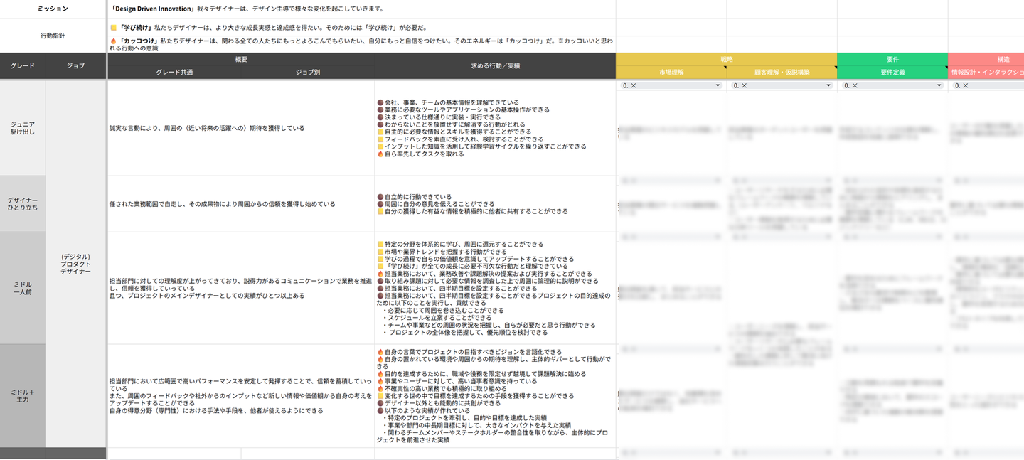 はい。特徴的なのが「スキルレベルシート」です。これはデザイナーに必要なスキルや行動を可視化したチェックシートで、自分がどの段階にいるかを自己評価できるものです。