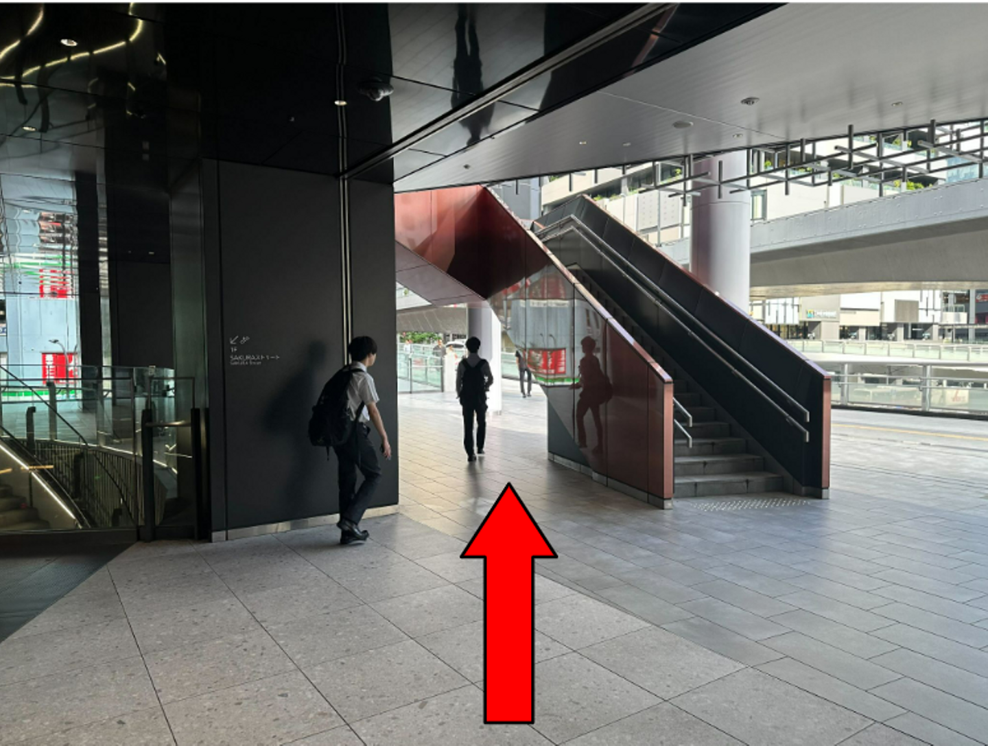 新南改札を出て右に曲がり、まっすぐ進むと、目の前にエスカレーターが見えますので、