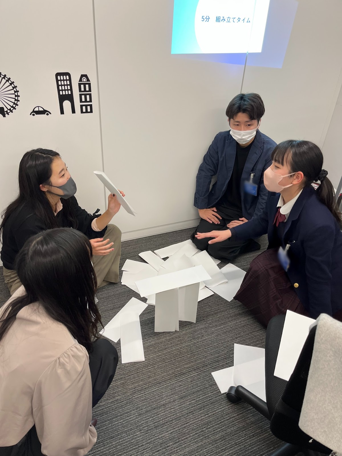最初は紙をどのように組み立てていくのか各チームで話し合いがされており、隣のチームを横目に紙を折ったり、重ねてみたりそれぞれが試行錯誤。