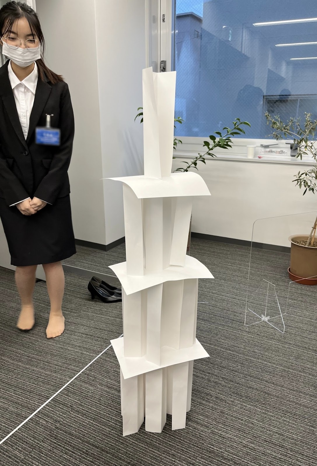A4コピー用紙を用い、制限時間内にできるだけ高いペーパータワーを作るもの。仲間と協力できるポイントを見つけながら完成させるというシンプルなゲームです。