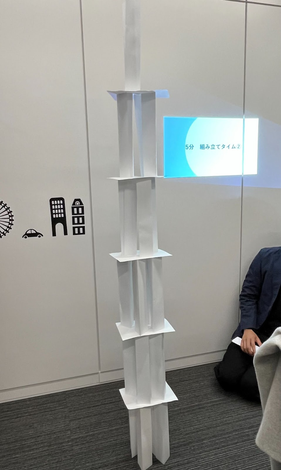 このゲームでは、高いタワーを目指すためにはどうすればいいのか?というのをチームで話し合い、協力・工夫や改善をしながら1つの目的を達成してもらうことを目標としたもの!このワークショップを機に新入社員となる彼らの交流を深め、チームビルディングに繋げることを背景に行われました!