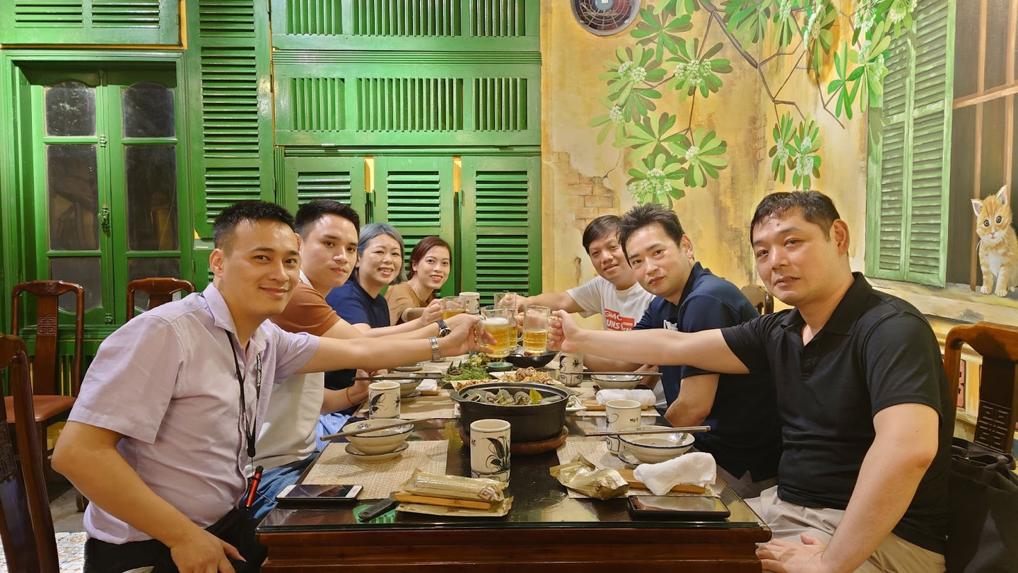 (ベトナム出張で仲間と交流する猪股さん(右))