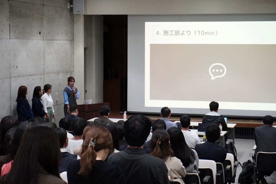 今回は施工部の新入社員3名が担当。施工部の仕事内容について「工事前・工事中・工事後」の3フェーズに分けて分かりやすく説明してくれました。