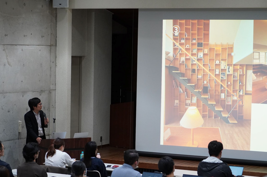 ▲自身の体験をもとに、現地のホテル等の住環境を詳しく紹介する小倉。「台湾は日本同様に古い建物が多いので、リノベーションのビジネスチャンスがありそう」といった、非常に興味深い内容でした。