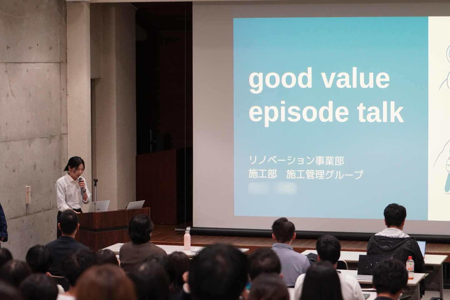 10月度はリノベーション事業部 施工部のU.Mが担当。「“自分の為に” と思っていることが、周りの人に与える影響」というトークテーマで、先述の4つのバリューのうち「オーナーシップ」と「”未来のゴール”志向」について語ってくれました。